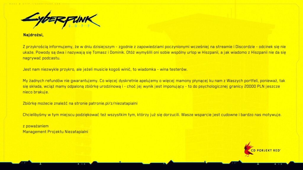 Ogłoszenie o dzisiejszym lajwie w formie audio dla tych, którzy znają nas tylko ze Spotify czy innych platform podcastowych – coby też wiedzieli, co się dzieje.